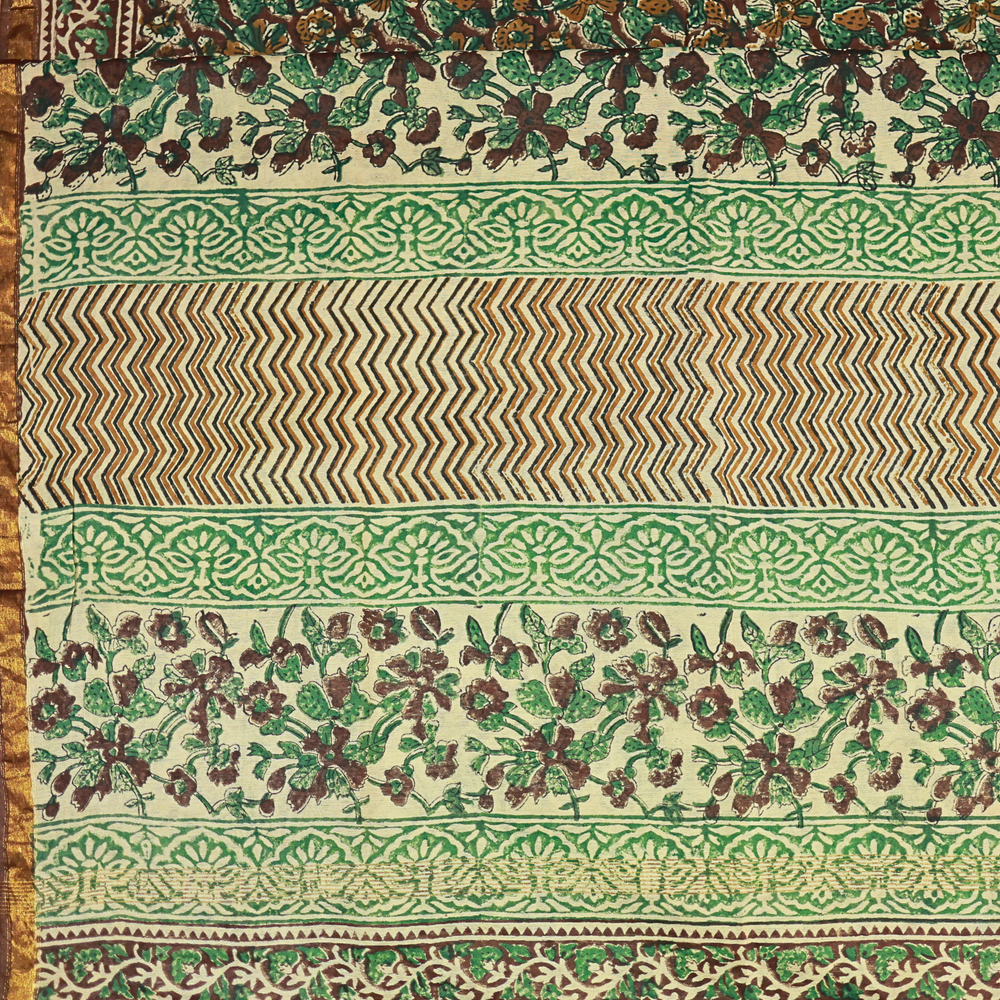 Kalamkari cotton sarees feature hand-painted or block-printed designs on soft, breathable cotton.